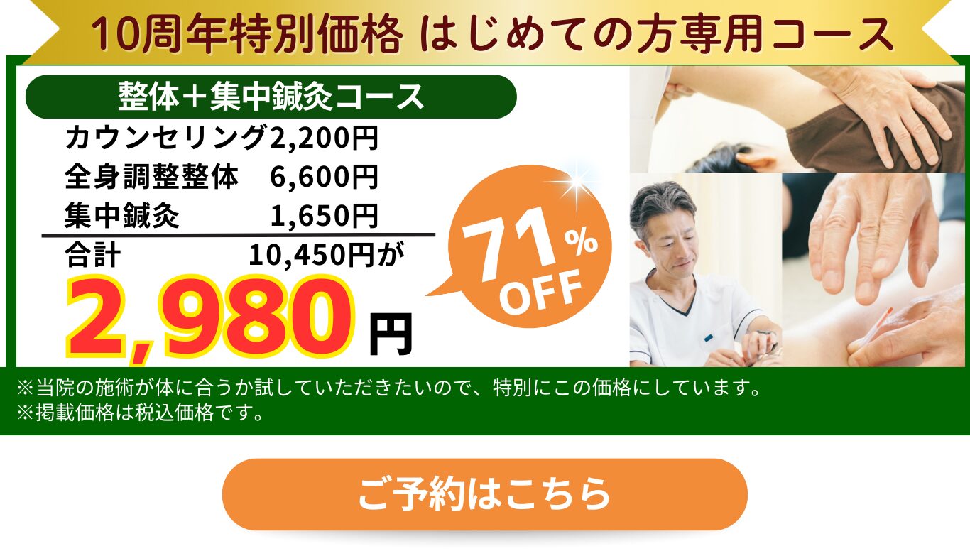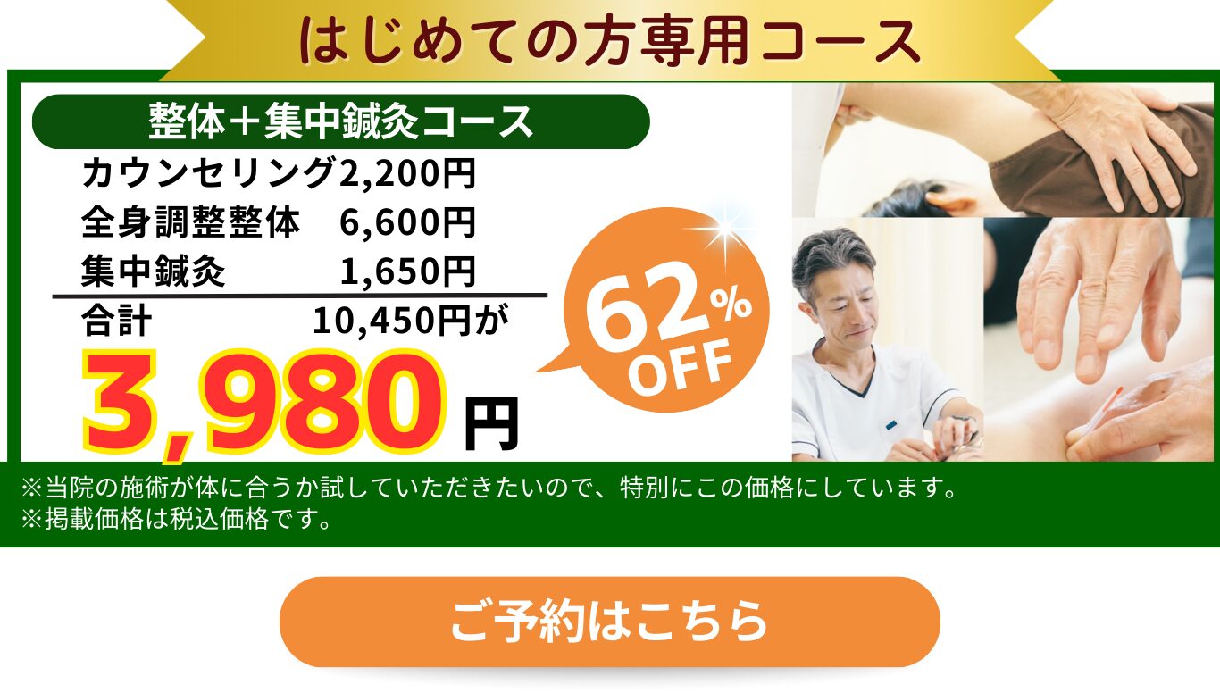 2回目以降は全身調整整体、全身調整鍼灸、整体+部分鍼灸コースは30分ほどの滞在となります。