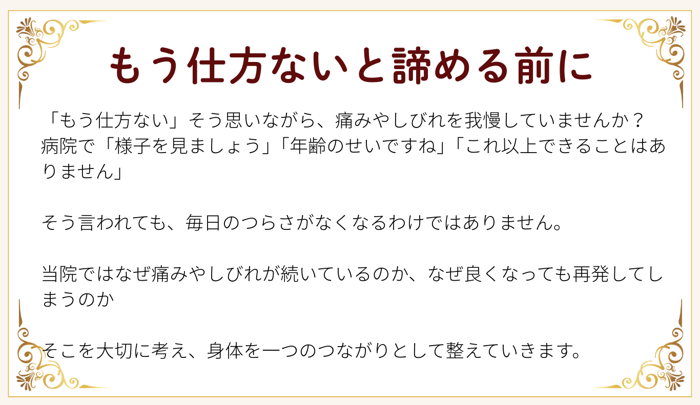 もしあなたが今、不安や痛みを抱えているのなら、どうか一度ご相談ください。症状の改善はもちろん、健康を維持し、これからの人生をもっと軽やかに過ごせるよう、全力でサポートさせていただきます。