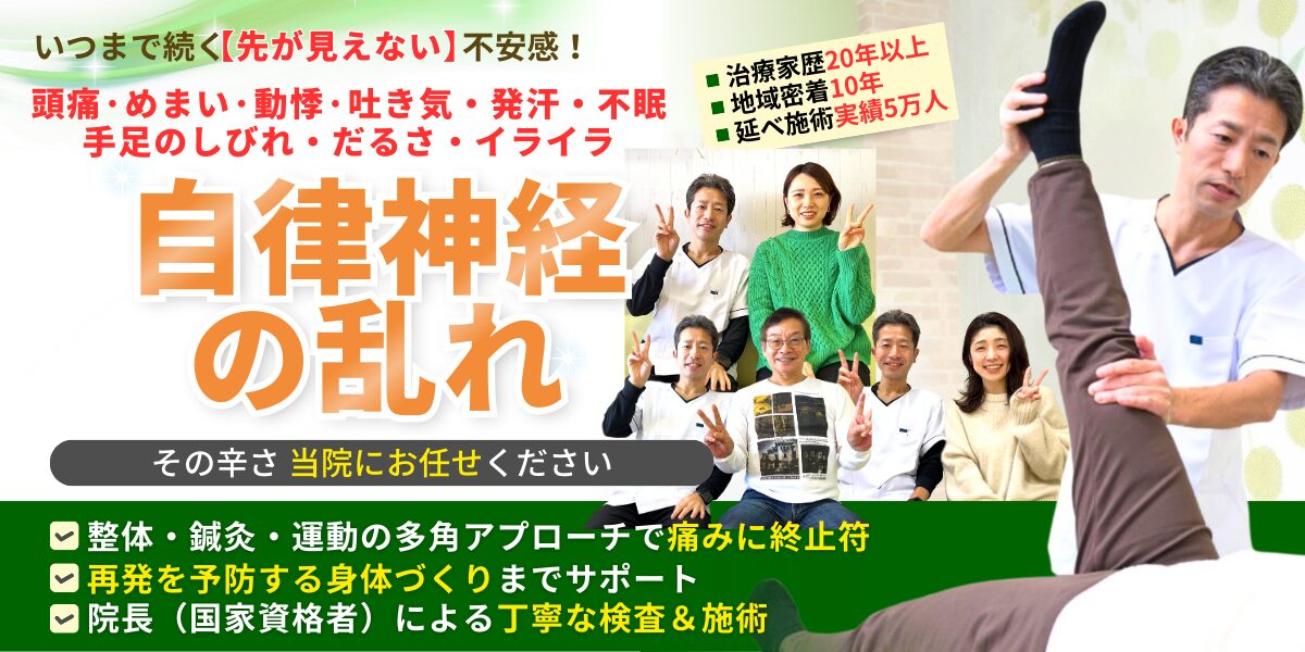 薬を使わず、自律神経の乱れを改善させたいお客様は、おひとりで悩まずに当院の施術をどうぞお試しください。お客様が笑顔の生活に戻れるよう全力で施術にあたります。一緒に自律神経の乱れを克服していきましょう!