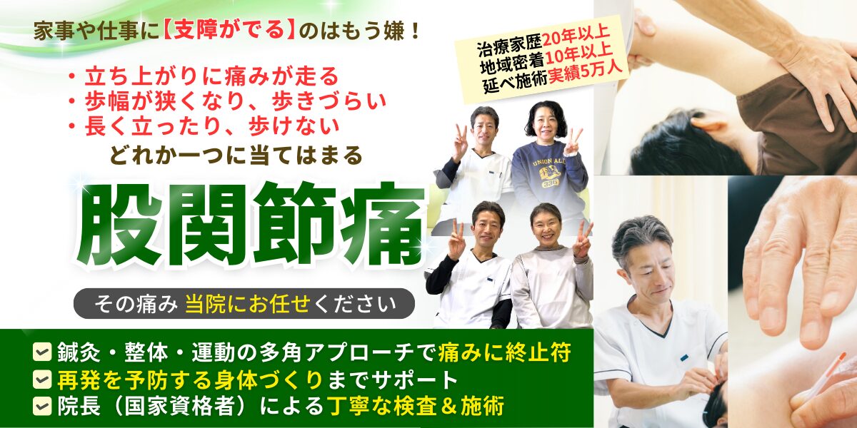 当院の整体で身体のゆがみを整え、股関節にかかる負担を正常に戻し、鍼灸でコリや痛みを解消し、股関節の可動域を上げて、元気に歩ける身体に戻していきましょう。