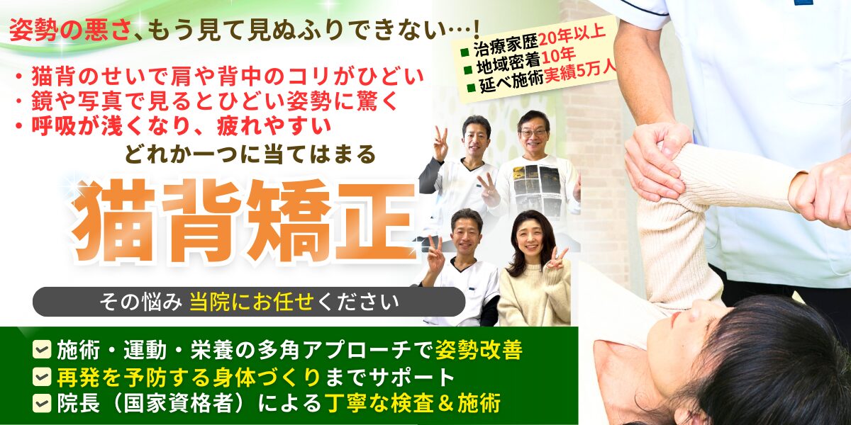 - 猫背矯正では固まった胸椎と肩甲骨がポイント!
