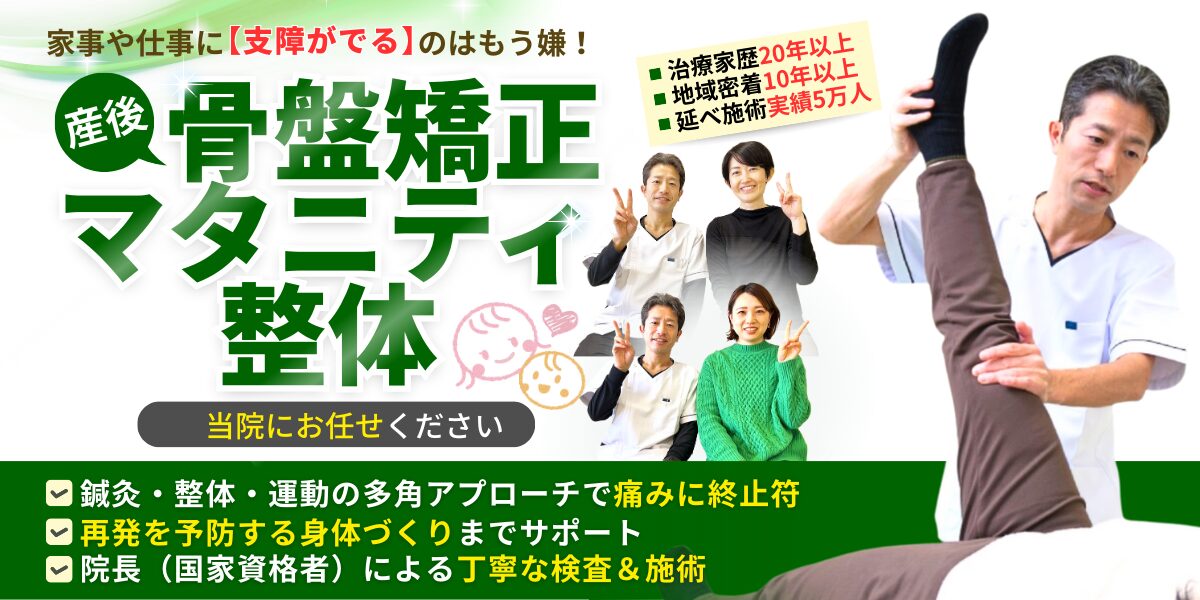 出産による骨盤の歪みやずれ、育児(抱っこ・授乳など)で歪んだ身体を、骨盤だけでなく、全身の筋肉や関節を誰でも受けれるソフトな刺激で調整していきます。